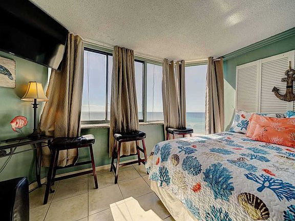Located towards the end of the building providing a South East view of the gulf and overlooking the pool and common areas. This condo is a must have! Nicely furnished with two full beds and a leather sofa. Four seater dinette. Mirrored walls create an open feeling. Kitchen has been updated with newer countertops and stainless appliances. Dining room has a custom built pantry area for extra storage. Large owners closet's for all your vacation needs. Feels very spacious for a unit this size. Top of the Gulf includes pool, hot tub,an upstairs sundeck and a beach front deck. Picnic tables,a tiki bar called the surf shack for drinks and burgers tacos and more. Convenient to all of the beach amenities and Panama City shopping and dining.