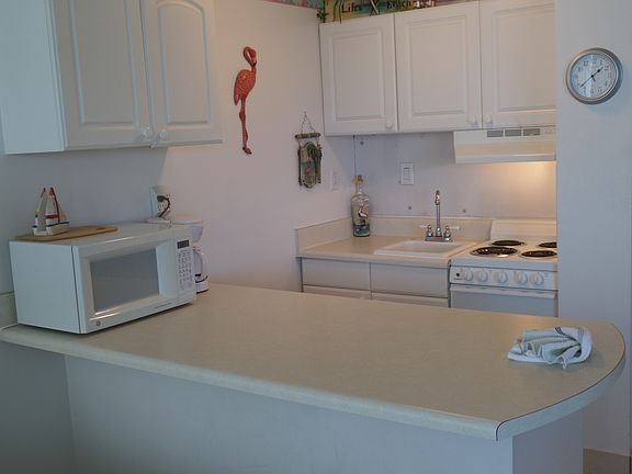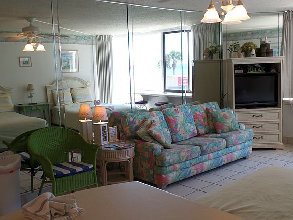 This is a Gulf-front, second floor, studio-efficiency Condominium at the Top of The Gulf Resort. Has two full beds and pullout couch. Will sleep 6. This condo is decorated with a flamingo decor throughout. Our Condominium is fully furnished. Everything is supplied except for your beach towels. You'll love the fully- equipped kitchen, dining area, and a 14 x 18 living/sleeping area, walk-in closet, and private bathroom.