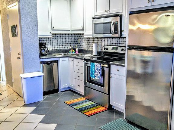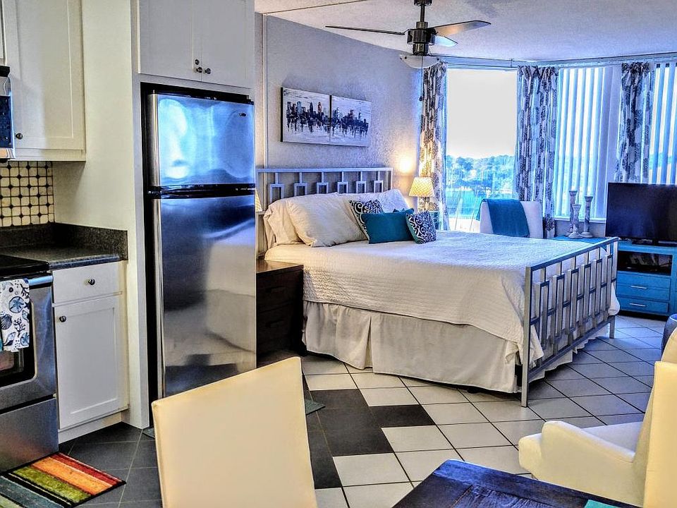 Don't miss this beautifully remodeled efficiency studio in a Gulf front complex. Modified floor plan now features a full size L shaped kitchen with all new cabinets, counters, backsplash and stainless appliances including a dishwasher, full size range, micro/range hood and refrigerator. New water heater and $5K HVAC unit. All new boutique style furnishings including dining for 6, sofa and chair, flatscreen TV and console, and King bed. Twin bunks in hall! Updated bath. Offered turn key, rental ready. This is a perfect, affordable second home or rental investment with onsite management available. Top of the Gulf has a Gulf front pool and sundeck, kiddie pool, snack bar, fitness room, laundry, security and convenient surface parking. Restaurants, golf, marinas, family recreation, fishing and
