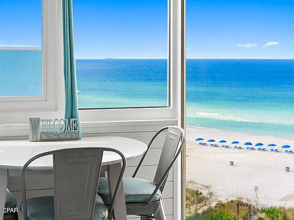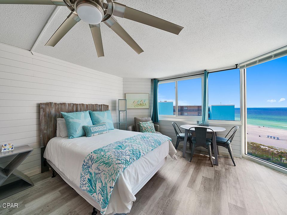 Unique opportunity to own this cozy and newly updated highly desired top floor condo with spectacular views of the Emerald Coast. This unit is offered fully furnished, featuring two new queen beds , flatscreen tv, and a dining table for four beside a floor to ceiling window overlooking the white sandy beaches. This unit is fully updated with new AC, hot water heater, and cosmetic features such as a new backsplash, appliances, countertops, wood paneling, and more. This building boasts newly redone elevators and recently resurfaced floors. Newly replaced exterior doors and windows, railings, and you can enjoy complex wide wifi. Grills are available for residents to BBQ and laundry services are available through the complex! The complex offers multiple balconies to enjoy panoramic views of the gulf, an awesome place to watch the waves crash and the vibrant sunsets. The well maintained and cozy complex of 200 condos and 8 stories offers private beach access. This appealing location is walkable to Pineapple Willy's beachfront restaurant, Signal Hill Golf Course, and many other restaurants and popular attractions. The complex is located in Top of the Gulf, a highly desired area, committed to excellence and community. This is an opportunity to own a cozy slice of paradise in Top of the Gulf.