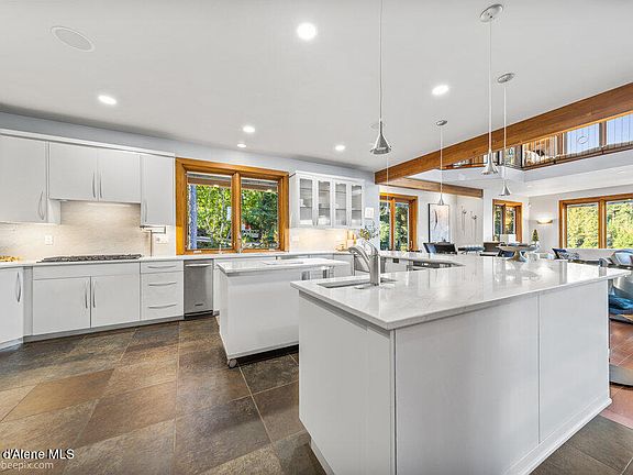 Experience refined riverfront living at this architecturally stunning custom home with 100' of year round deep water frontage on the Spokane River! The windows showcase the breathtaking views from nearly every room, blending contemporary design with warm Northwest elegance. Fresh paint, Brazilian teak flooring, exposed beams, and a chefs kitchen built for entertaining. The serene primary suite offers an office and private balcony overlooking the riverfront. The outdoor living area shines with a stone patio, turf putting green and a sandy beach! Walk down to your new private dock and you are only minutes away from CDA! A true example of North Idaho waterfront living.