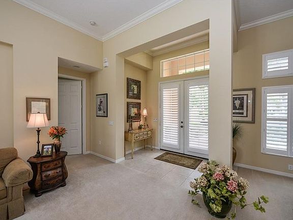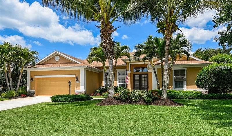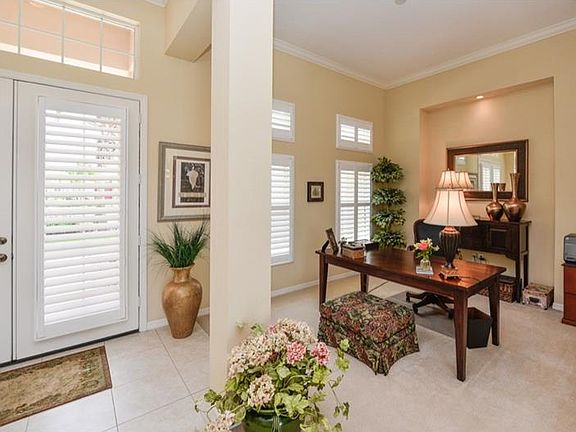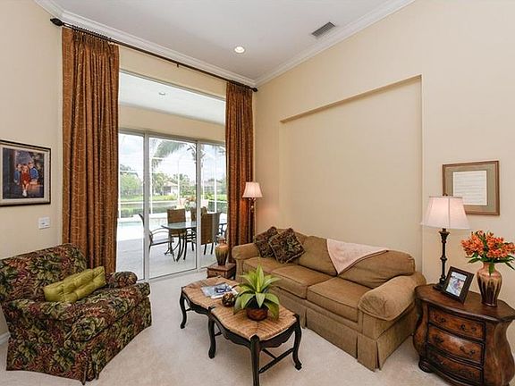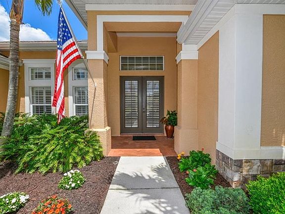 Lush landscaping with tropical coconut palm trees set the stage for this distinctive 3 or 4 bedroom residence. Enter the foyer to soaring 12 ft. ceilings and sliding glass doors which open this home to showcase the spacious lanai and swimming pool, overlooking a peaceful lake. From the outdoors in, this home features full-scale comfort for your family and is the perfect setting for relaxing and entertaining! The true heart of the home is the tremendous gourmet kitchen featuring: Maple finish cabinetry with Cambria quartz countertops, Wall ovens, Natural Gas cooktop on island, walk-in corner pantry. The Dinette and breakfast bar provide ample seating and is inviting for family and guests alike and opens to the family room with built-ins. Natural light floods the Formal living and dining rooms. The split-bedroom floor plan encompasses three or four roomy bedrooms with plenty of space for sleep, study and storage. The gracious master suite presents coffer ceilings with spacious walk-in closets and ensuite luxurious bath with dual vanities and soaking tub. Additional detailing of this special home includes: full French entry door, crown moldings, plantation shutters, and window seat. This is truly a home where friends and family will gather and memories will be made! Wisteria Park features a Community Gathering Area with heated pool, spa, playground and gazebo. This neighborhood is conveniently located within walking distance to DeSoto National Park and Robinson Preserve.