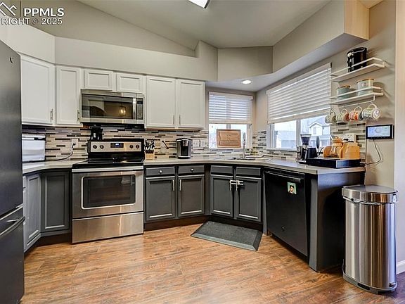 This incredible ranch style home features a semi private main floor with the living room being set apart of the kitchen area. Walking into the home the living area has vaulted ceilings adding to the expanse of the area featuring a fireplace and walk out access to the back yard. The eat-in kitchen is off the entry way and features stainless steel appliances, gorgeous tile backsplash, and ample cabinet space. The main floor has three bedrooms including the primary suite with barn door access to the walk in closet and ensuite bath featuring updated double vanity and bath tiling. Bedrooms two and three with a second full bath are on the opposite side of the living area which provides privacy from the primary bedroom. Walking downstairs the large family room has natural light flowing throughout. The basement also has bedrooms four and five and a third full bath. This home is perfect for those that need space and privacy for the at home worker or a family with children. The fenced backyard with offset deck for entertaining is another added bonus for the upcoming summer months. This home has so much to offer and is located on the southeast side of Colorado Springs in Fountain with ideal access to I25 and Fort Carson. Minutes away from the elementary, middle, and high schools as well as the YMCA. The home provides easy access to nature with Fountain Creek Regional Park a short distance away with playground areas and walking trails galore.