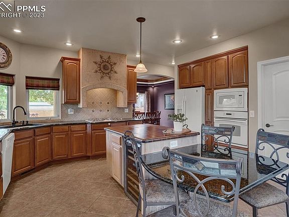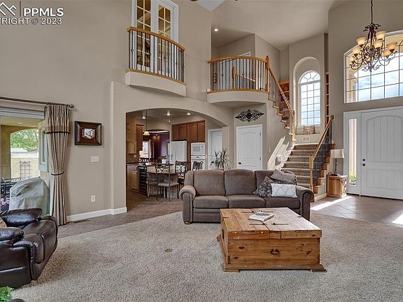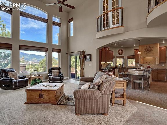 Come see SPECTACULAR PIKES PEAK VIEWS from this hilltop 2 story with multiple decks and patios to enjoy full front range Mountain Views. This Tuscan style 2 story is loaded top to bottom with upgrades including Custom tiled entry and floors into a granite topped kitchen with gorgeous wood cabinets and all kitchen appliances. The 2 story living room accents the Views with floor to ceiling windows and cozy gas fireplace. Enjoy either the main level master suite or the luxury loft master suite plus 2 more huge bedrooms and Travertine tiled baths in the fully finished walkout basement. The basement includes a theatre and game room plus full size bar and wine cellar plus cozy Harmon energy efficient pellet wood fireplace. Central A/C, concrete tiled roof, stucco exterior, 2 laundry rooms, stamped concrete covered patio, 3 car garage with shop and 2X6 construction all on 1/3 acre lot in a great Central location. MAKE THIS YOUR HOME!!