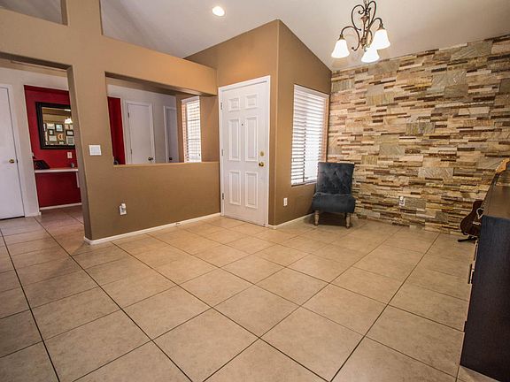 Comfortably nestled on a spacious cul-de-sac lot, this beautiful 1,602 square foot home offers 3 bedrooms + 2 bathrooms. The interior boasts an open floor plan, soaring high vaulted ceilings, white faux wooden blinds, Trane A/C, and washer/dryer/refrigerator that convey! The large kitchen embodies plentiful refinished cabinetry, granite countertops, and sophisticated stainless-steel appliances to include a wine refrigerator! Awash in natural light, the master suite has a large walk-in closet and full bathroom with dual sinks, and separate tub and shower. The vast backyard is an entertainer's dream with its extended covered patio, fire pit, and granite sport court surrounded by mature trees and desert landscaping.