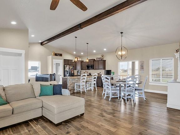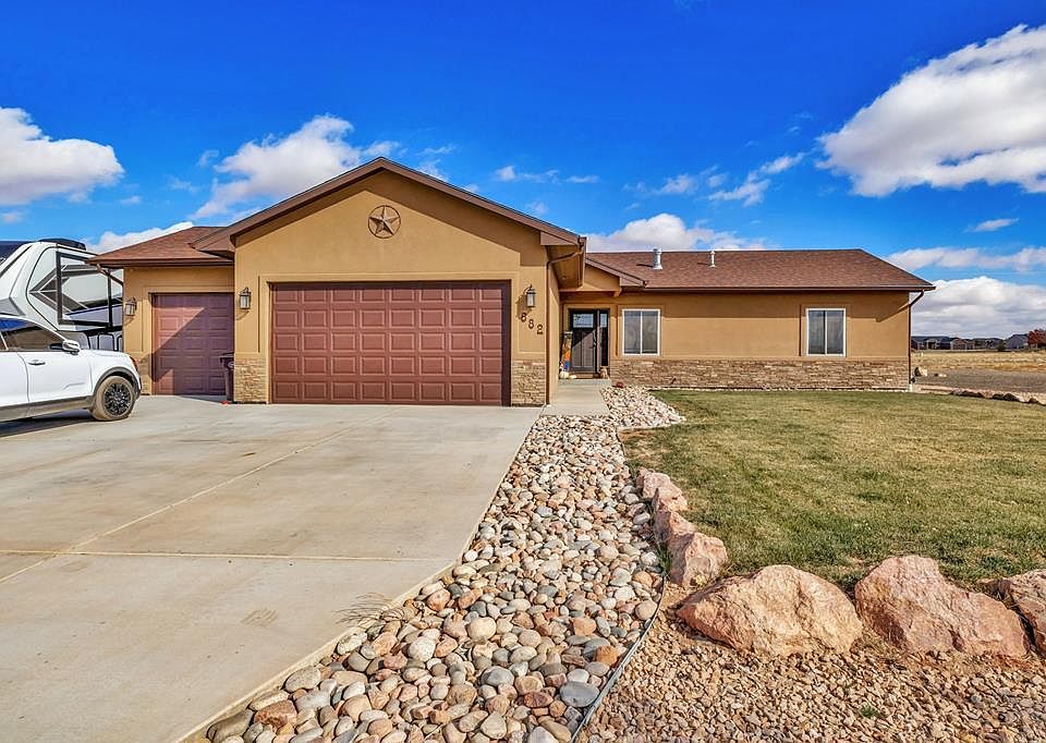 4 large bedroom/3 bathroom home with 3 car oversized attached garage on 1.07 acres. Living room features vaulted ceiling and a cozy stone fireplace. Adjoining dining area with walk-out to the huge covered patio. Kitchen features Samsung stainless steel appliances, pantry, desk area and a matching stoned island breakfast bar with sink. Bedrooms have ceiling fans. Primary bedroom features adjoining bathroom with double sink vanity and a large walk-in shower. Granite counter tops throughout. Enjoy your free time in the basement family room with matching stoned wet bar. Fenced backyard has grass area and Xeriscaping. Lean to with water for your animals.(Fence just needs to be added) Lots of room to park your toys and RV(with hookups). Mountain views compliment this uniquely designed one of a kind home. Interior of home is sprinkled for extra safety and insurance benefits.