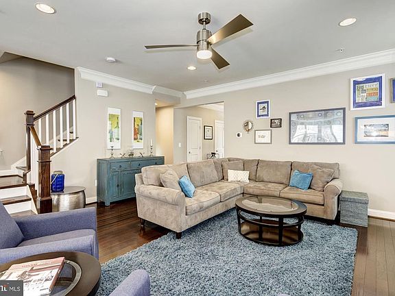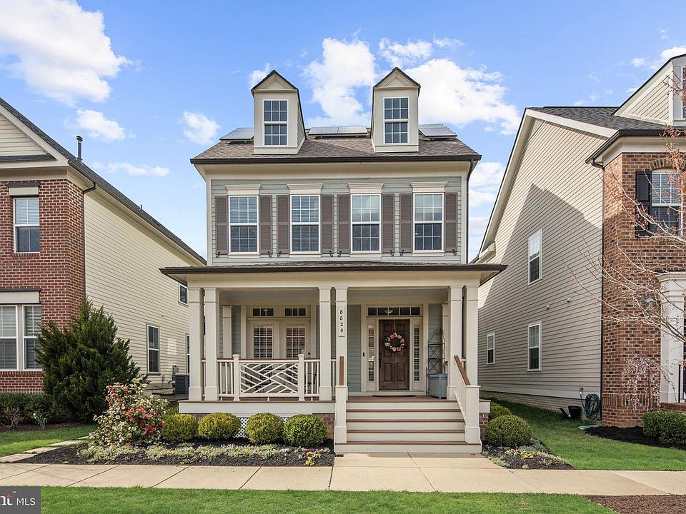 Stunning Colonial located in the coveted Maple Lawn community of Fulton. Open concept floor plan boasting a soothing neutral color palette, beautiful hardwood floors and Craftsman railing. Impressive living room highlights a gas fireplace set in modern tile and crown molding with adjacent dining area. Sunbathed gourmet kitchen boasts an oversized island with sink and breakfast bar, granite counters, stainless steel appliances and pendant lighting. Spacious master suite offers two walk in closets, crown molding and recessed lighting. Luxury master bath features a granite dual vanity, oversized frameless shower with dual shower heads. Opulent family room complete with a wet bar adorned with custom metal mosaic backsplash that opens through hanging barn doors to the fantastic media room including a big screen and projector. A bedroom and full bath complete the lower level. Expansive stone patio with waterfall fountain. Detached 2-car garage. Included: Nest camera bell, owned solar panels