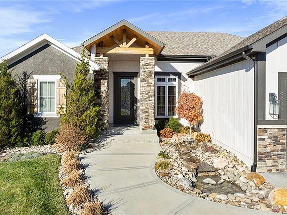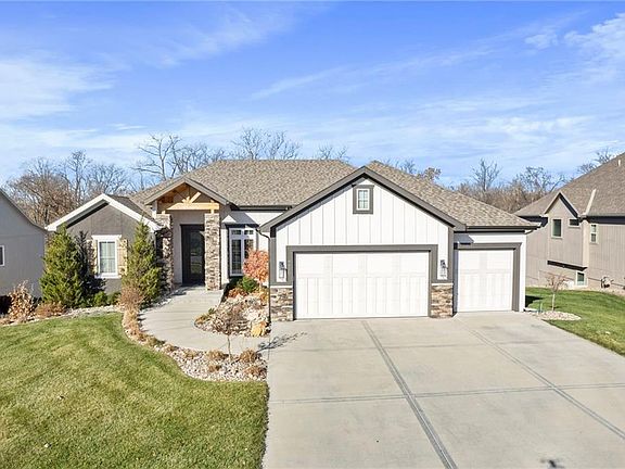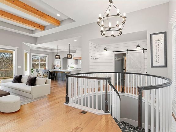 Boasting an array of sleek finishes and a thoughtful open plan layout, this immaculate 5-bedroom, 4-bathroom home is a paradigm of contemporary living located in Liberty School District. Features of this nearly 3300 sq. ft. home include; wide plank hardwood floors, custom cabinetry, waterfall edge quartz island, stainless steel appliances, wet-bar and custom built wine cabinet. Step inside this beautiful home and fall in love with its open spaces including two living areas, 3 main floor bedrooms, main floor laundry and a spacious covered deck. Primary suite with feature wall, soaring ceilings and sitting area. Primary bathroom is a spa-like retreat with its free standing soaker tub, double sinks, HUGE tile shower and walk in closet. The kitchen boasts custom cabinets, waterfall edge quartz island, stainless steel appliances and spacious pantry. The living area off of the kitchen has a stunning fireplace and double sliding doors that make indoor/outdoor entertaining a breeze. Walk down the stunning curved staircase to the basement where you're greeted by the custom built wine cabinet with stone accent wall and wet-bar. The walkout basement makes this entertaining space light and bright to enjoy a drink with friends or a game of pool. The backyard is ideal for those who are looking for a gorgeous yard that backs to green space. Located in the sought-after Shoal Creek Elementary. This home is a short 20 minute drive to Kansas City International Airport.