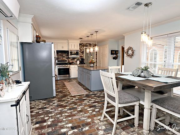 The spacious kitchen boasts granite countertops, stainless steel appliances, and a large island with bar seating. Brick flooring in the kitchen extends into the foyer, breakfast area and laundry room.