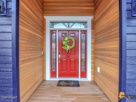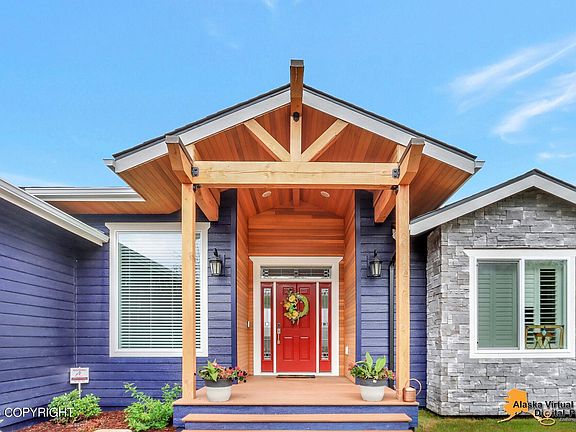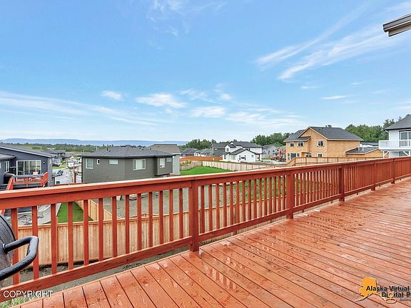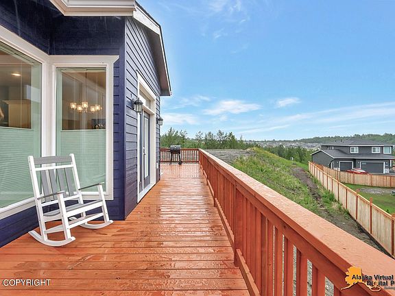 Beautiful custom ranch on quiet cul-de-sac with amazing view of the Chugach Mts. 10 ft ceilings in greatroom w/glass wall. Gas fplc, wood laminate floors, upgraded cabinets w/Quartz countertops and GE Profile appliances. Top of the line Hunter Douglas remote blinds, security system, flat screen tv's and built in air conditioning. Like new...completed in June of 2022. Now you see me..........