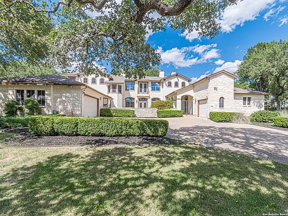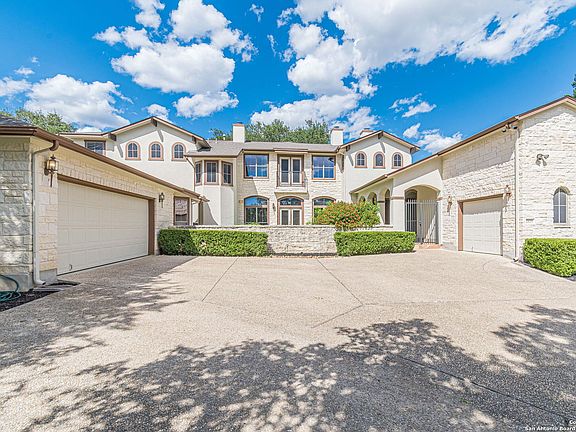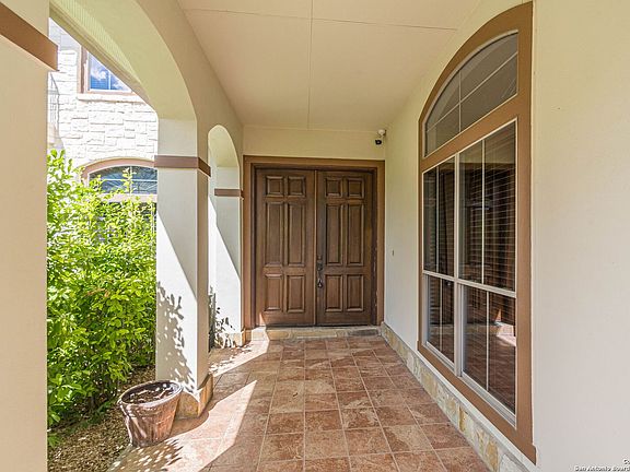 Nestled on a serene 1.32-acre cul-de-sac lot, this Mediterranean-inspired estate by Rialto Homes blends timeless elegance with modern comfort. Professionally landscaped grounds, mature oaks, and a private front courtyard set the tone for this 5,105 sq. ft. retreat designed for both grand entertaining and everyday living. Step inside to soaring ceilings, rich wood floors, and open living spaces filled with natural light. The chef's kitchen is a showstopper, featuring premium stainless steel appliances, a Viking range, granite countertops, a huge radius island, and built-in speakers throughout the home for effortless entertaining. The inviting living areas boast three fireplaces-one in the formal living room, one in the family room, and one in the primary suite-creating warmth and ambiance throughout. The family room seamlessly connects to outdoor living, where a covered patio, outdoor kitchen, and balcony overlook the sparkling pool, spill-over spa, and sports court. The master retreat is a sanctuary with private outdoor access, a sitting room with fireplace, spa-like bath with dual vanities, soaking tub, and a spacious wardrobe closet. With 6 bedrooms, 5 bathrooms, a dedicated study, and guest suite downstairs, this home provides the flexibility and comfort every lifestyle needs. Additional highlights include a 3-car garage, oversized laundry room, dog run, shed, and freshly repainted interiors in Sherwin Williams' Agreeable Gray for a timeless, move-in-ready feel. Located minutes from Randolph AFB, top-rated schools, shopping, and with convenient access to Loop 1604, I-35, and Austin, this estate offers the perfect blend of privacy, luxury, and accessibility.