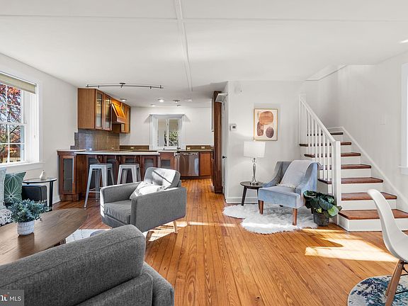 New in Berwyn Heights, this charming storybook cottage is set back from the road on a large wooded lot. The covered entrance leads to an open-concept living and dining area full of natural light. The renovated kitchen has granite countertops, a seating peninsula and recessed lighting. At the back of the home is a bedroom with windows on three sides as well as a door to the backyard - it could easily become a multipurpose family room or home office. Storage and a full bath complete the main level. Upstairs is a large, private, primary bedroom with en-suite bathroom, walk-in closet, convenient second floor laundry, knee-wall storage and a cozy window seat. The unfinished lower level is accessible from the backyard. The fenced backyard features a garden shed - great for storage or extra space. Driveway for off-street parking.