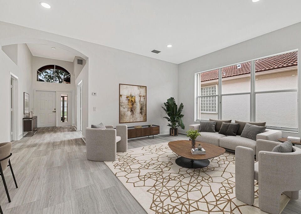 Modified lakefront Mediterranean with the wall down! 2024 style floor plan right here in Valencia Shores! Renovatated from soup to nuts. Be first to live in this luxurious interior. No expense was spared. Beautiful vinyl flooring flows throughout living areas & then stylishly segways into the bedrooms w/an exquisite complementary porcelain tile. The bathrooms are absolute showstoppers! Primary bath has beautiful stand alone tub, porcelain tile walls, frameless glass shower his/her sinks with new cabinety and new quartz countertops., Kitchen is all new,white with solid wood cabinetry,all new stainless appliances ,extended quartz waterfall center island overlooking the entire floor plan with no walls obstructing the wide open view of the floor plan or the lake. Newly landscaped front and Valencia Shores has 2 clubhouses that include a state of art Athletic Center, resistance pool, lap pool, and indoor/outdoor whirlpool, salon, 10Tennis, 6Pickleball, 3Bocce Courts, Pro Shop, Happy Hours! Dine with friends at full Serv Bistro, Best 55+Valencia!
