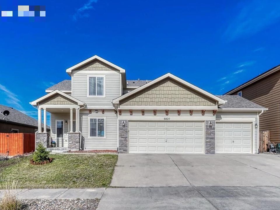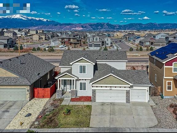Gorgeous Pikes Peak views accentuate this fabulous 2010-built two-story with main level master bedroom suite in Forest Meadows. Enjoy the generous 5 bedroom, 4 bathroom layout with finished basement and 3 car attached garage. Engineered wood flooring graces the main level. Living room features vaulted ceiling, gas fireplace, and a great Pikes Peak view. Primary bedroom on the main level has vaulted ceiling, wood floor, and a stylish barn door to the bathroom. Primary bathroom includes soaking tub, separate shower with tile surround, double sink vanity with granite counter, tile floor, and walk-in closet. Granite counters and backsplash distinguish this spacious kitchen, which includes ample cabinetry, stainless steel appliances, pantry, and counter bar. Dining room faces the front of the home. Powder bath and laundry room with included washer and dryer complete the main level. Upstairs an airy loft overlooks the living room. Every bedroom has a walk-in closet! There are two upper level bedrooms and a full bathroom with tile floor and tile shower surround. Finished basement provides a large rec room, two bedrooms, full bathroom with tile, and lots of storage space. Central A/C will keep you cool all summer. Custom back patio offers a beautiful mountain view! Pergola and patio chairs are included for entertaining. Back yard is fully fenced and includes automatic sprinkler system. Located in Falcon School District 49, a school and park are just a few blocks away with playground and walking trails. Forest Meadows is very convenient to medical facilities and a growing slate of diverse dining, shopping, and entertainment amenities along North Powers Blvd with quick access to the Air Force Academy and Peterson SFB. Treat yourself to this home with an awesome layout, mountain view, and amenities in an outstanding neighborhood!