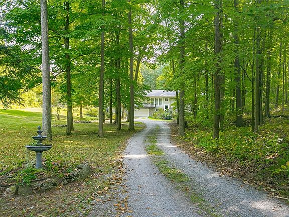 Massive $60,000 price adjustment! Don't miss this great opportunity for 8.7 wooded acres of prime deer hunting property, 1 mile from the Monroe County Border! With 3 separate and unique living areas, this home can cater to your changing needs. 1st: A semi-detached 400+ sq ft "No Step" In-law apartment w/private entrance, full kitchen, bath, LV and bedroom with sliders to the back yard. 2nd: The 800+ sq ft "lower level" is actually Ground Level Walkout (no steps) to both the garage and back yard with a 19x28 Living area (perfect for a Game Room or Man Cave), wb fireplace, sliding doors to a back patio, full bath, bedroom and 11x12 laundry (with room for a second kitchen.) 3rd: Enter by the Main Entrance and up 8 or so steps to the Heart of the House. A 500+ sq ft light-filled Formal Living Room with A/C via minisplit, 4 bedrooms, 2 full baths, den, dining area and updated kitchen with granite countertops. Bask in the 14x30 South facing Solarium also with an A/C mini-split! The Main bedroom opens to a 450 sq ft covered deck! All this for under $150 a sq ft, with public water, and room to Breathe! Only 30 min to Roch. airport, Henrietta, Brockport, Geneseo, 9 min to Thruway!