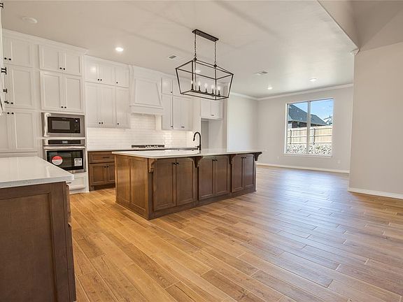 FENCING INCLUDED! This Wesley Bonus Room floor plan includes 3,285 Sqft of indoor living & 345 Sqft of outdoor living space. There is also an extended 3 car garage with a storm shelter installed! The 2' extension is featured on the double bay. This home offers 5 bedrooms, 3 full baths, 2 covered patios, 1 large bonus room, a powder room, & a utility room. The living room supports a perfect cathedral ceiling detail with a crows feet enhancement, 3 large windows, a ceiling fan, wood-look tile, & a gas ignition fireplace that is surrounded with a stacked stone detail. The kitchen boasts stunning pendant lighting, a gas range, an electric oven, 3 CM countertops, tile backsplash, well-crafted cabinets to the ceiling with under cabinet lighting, & a large center island that holds a roomy farm sink & a dishwasher. The primary suite provides a sloped ceiling detail, a ceiling fan, windows, & our cozy carpet finish. The primary bath has a batwinged vanity, a large walk-in shower, a Jetta Whirlpool tub, & a HUGE walk-in closet that connects to the utility room! Covered outdoor living holds a wood-burning fireplace, a TV hookup, & gas line! Home lastly includes a water-saving tankless water heater, a whole home air filtration system, R-44 insulation, & so much more!