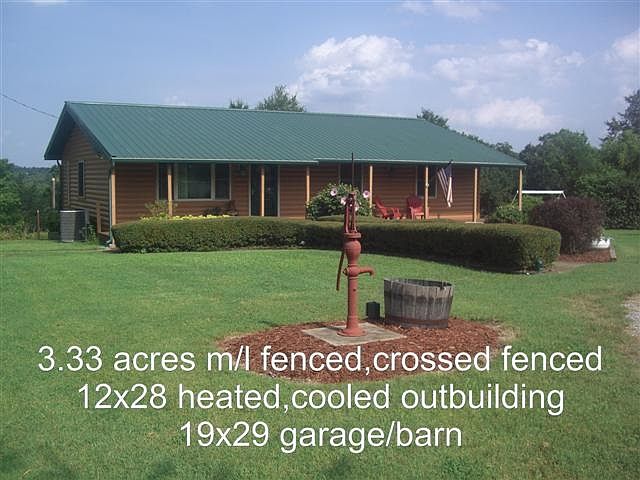 Beautifully landscaped 3.33 ac m/l this low maintenance vinyl log sided home has a new metal roof & all new vinyl pull out windows in 2010. Open floor plan w/3 BR & a large BA/laundry room. Heated/cooled 12' X 28' matching log out-building. 19' X 29' detached garage/barn. Property perimeter fenced & x-fenced with gates. Bring the horses.