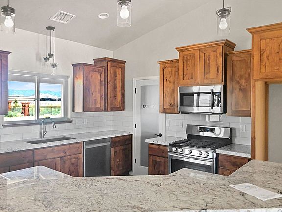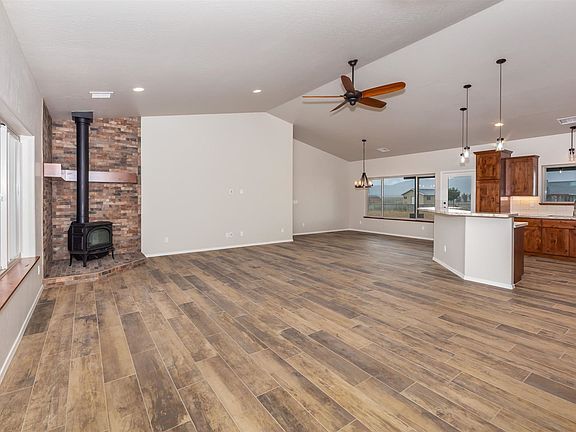 Brand new and beautiful with panoramic mountain range views from every window! Be the first to enjoy this spacious and lovely home in a rural setting yet near town and stores. Porcelain Tile flooring, knotty alder cabinets with full extension glides, wood window sills and a wonderful wood stove in the living room! The home has a generous three car garage for your cars and toys and a convenient laundry room off the garage with a deep, high sink. There are gorgeous high grade granite counter-tops in the kitchen as well as in both baths. Tubs and showers are all tile with inlays. All the vinyl dual pane windows are detailed with wooden sills.Top quality 30 yr architectural shingle composition roofing. This currently requires hauled water and there is a 2500 gallon storage tank, underground