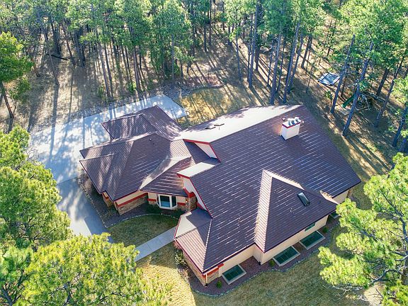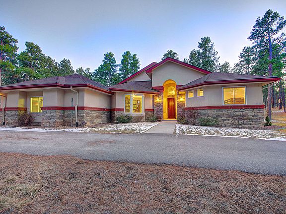 Nestled in the trees & privacy of Black Forest on 5+ acres, this stunning custom ranch offers peaceful tranquility coupled w/efficiency! Enter to find the dramatic 2-story foyer w/stunning tile flooring, & the great room beyond w/16ft ceilings, hickory flooring, wood burning stove w/stone surround & granite hearth. From there walk-out to the expansive covered patio to enjoy quiet mornings or entertain. Enjoy cooking in the gourmet kitchen complete w/42" cherry cabinets, skylights, granite counters, large island w/gas range, upgraded stainless steel appliances & large walk-in pantry. Separate dining room allows you to enjoy the backyard views from the large bay window, & floods the main level w/natural light. Retreat to your main level master Suite w/ bay window, walk-out to patio, expansive walk-in custom closet & spa-like bathroom w/separate vanities & jetted soaking tub. An additional main-level bedroom & ¾ bath supply an ideal guest retreat. Also on the main-level is an office w/custom built-in desk & closet, & spacious laundry room. Head downstairs to entertain in the expansive family room w/wet bar, wood-burning stove & plenty of room for a theater area or game table. The state-of-the-art exercise room is complete w/rubberized floor, or w/walk-in closet could easily be an additional bedroom. Also on the lower-level are 2 ample bedrooms sharing a full bath, as well as a craft/hobby room & storage room providing space for everyone & everything! Radiant floor heating, 3.5 car garage, stone coated steel roof & 8" ICF Exterior Walls (insulated concrete forms) from foundation to roof line w/R50 insulating factor are just some of the efficiency features of this spectacular property! Located in Academy School D-20, this home offers tranquil Colorado living at its finest!