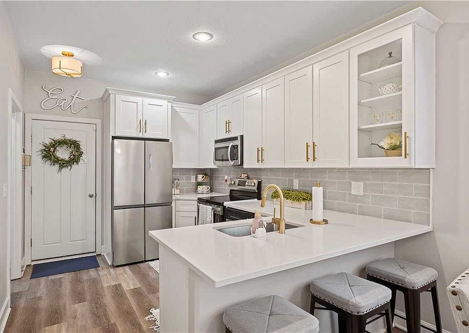 AND you'll absolutely love this home! It has been thoughtfully updated with designer touches over the last 3 years; new white kitchen cabinets, quartz countertops, luxury vinyl flooring, designer stair carpet, new lighting and more….. luxury style throughout! This homeowner has made efficient use of every inch of space in the home. This is a true 3 bedroom home with 2 bedrooms on the second floor and the third bedroom on the lower level includes an egress window & large closet. The laundry room on the second floor makes doing laundry convenient. This location is great with easy access to 152 on the west side of Liberty, shopping and restaurants, KCI, and more!