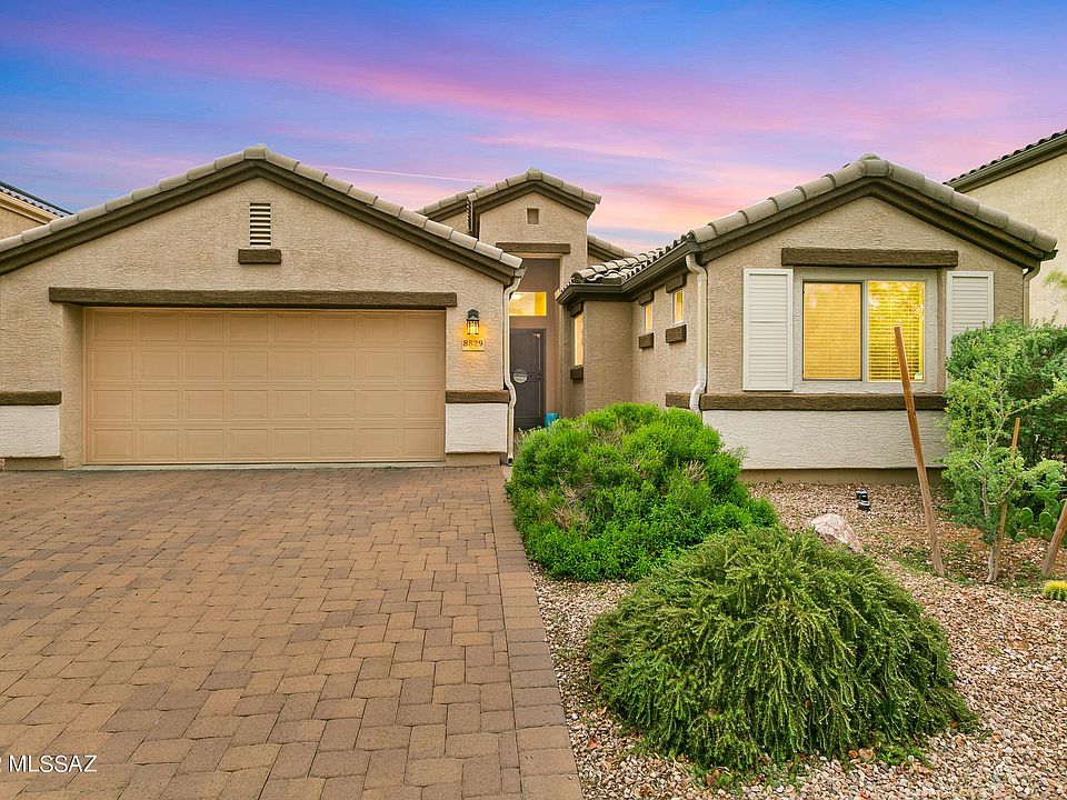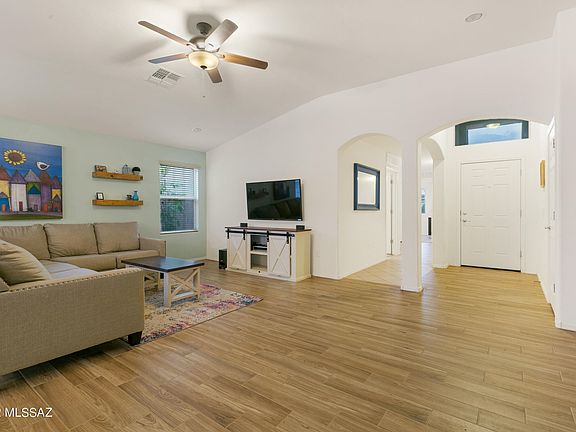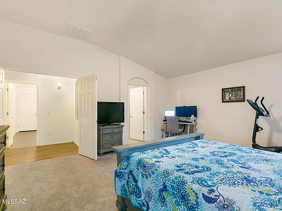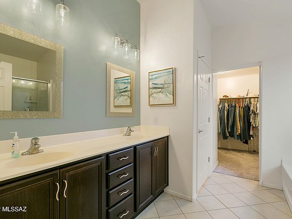This home is a must see! Multiple upgrades are present throughout including custom front door screen, large walk-in closet, garden tub, separate shower, and dual vanity in the primary bedroom, gourmet kitchen with dark espresso cabinets, large island and granite counter tops, wood grain ceramic tile in common areas, and much more! Enjoy the desert sunset under the covered patio of your beautifully landscaped backyard. Tucked away beyond the mountains in the Saguaro Bloom neighborhood,this home has the feel of privacy while still only being 5 minutes from a shopping center with a Starbucks! The neighborhood includes 12 community parks and playgrounds, swimming pools, a community center, and a splash pad. Don't miss this opportunity!