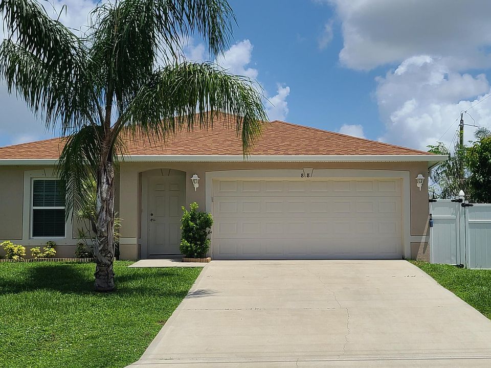 Step inside and feel the good vibes! This home's open concept living space is made for gathering & relaxing, including city water & tile flooring throughout. The kitchen is a real crowd-pleaser, with sleek SS appliances, generous counter space for your culinary experiments, cabinets for every gadget you own, and a walk-in pantry that's ready to store your shopping conquests. Tucked conveniently off the kitchen is a laundry room with a utility sink plus an extra closet. All 3 bedrooms have a walk-in closet! Step out back to your screened-in porch overlooking a paver patio and fenced-in backyard. Bonus points for the extra driveway on the side offering plenty of off-street parking for guests and a gate for easy backyard access. The garage even has a workbench, pull down attic stairs & hurricane shutters. When it's time to run errands or grab dinner, you're less than a mile from Publix, Walmart, Lowe's, and all the local favorites. Convenience? Check. Comfort? Double check.
