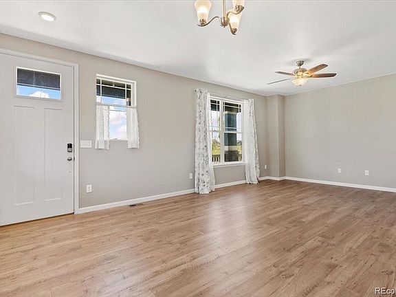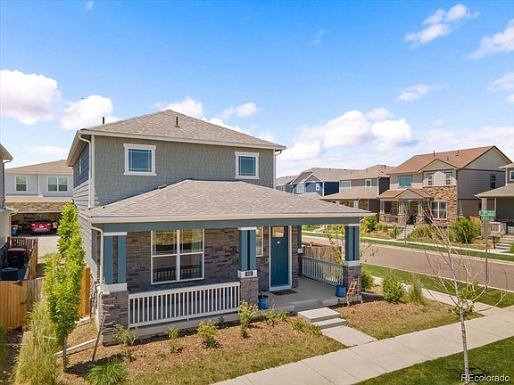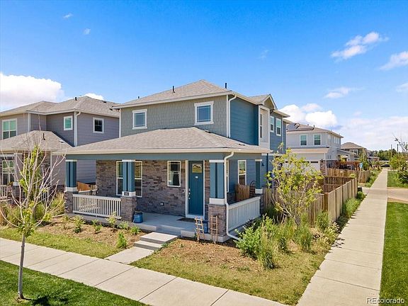 Seller is offering a $5,000 credit for landscaping at closing! Abundant natural light fills the main level of this two-story home every morning though the many main level windows. The home was built in 2021 by D.R. Horton with features like central air conditioning and tankless hot water heater. A large front porch greets you as you approach the house from the front. A porch made for rocking chairs and relaxation. The natural light and spacious living area offer a serene retreat in the Horizon Uptown neighborhood east of Denver. The home is situated on a corner lot with access to the “Great Park”, just a short walk away. The Great Park currently features a playground, pavilion, tennis courts, and tons of room for everyone to play in the grassy park. The home features 3 bedrooms, 3 bathrooms, a spacious main level, two-car garage, and kitchen. The open concept of the main level is perfect for entertaining, offering access to the back yard. The kitchen features a large breakfast counter with room for stools, a gas range, and granite countertops. A powder room is also conveniently located on the main level. Upstairs contains a primary suite with shower and dual granite vanity. A laundry room is neatly tucked into the second level for convenience. Two more bedrooms are located on the second floor, accompanied by an additional full bathroom just out side their doors. The upper area is completed by a small study or office area. The two-car garage has plenty of room for all of your Colorado gear to enjoy Summer, Winter, and everything you encounter in between. This home is turnkey and move in ready now!