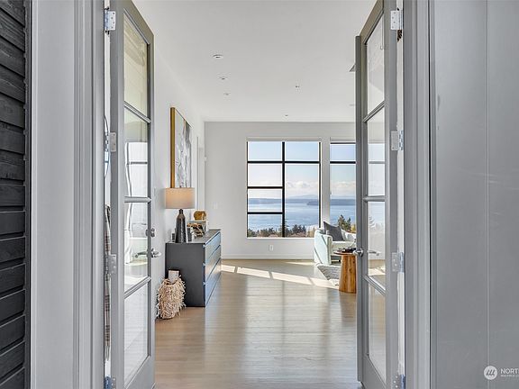 Impeccable modern masterpiece offering breathtaking views of Puget Sound and the Olympic Mountains, islands and sunsets from all levels. Elegant design, open concept with beautiful white oak hardwoods, soaring ceilings, and stunning open steel staircase. High end kitchen featuring custom cabinetry, Subzero and Wolf appliances, and beautiful marble counters. Upper floor has spectacular view master suite with amazing bath & huge walk-in closet plus a second ensuite bedroom. Lower level with additional bedroom, family room, wine cellar, and outdoor spaces. Two car attached garage with EV station. Privacy abounds, serene location, simply extraordinary!