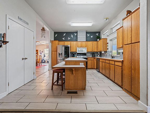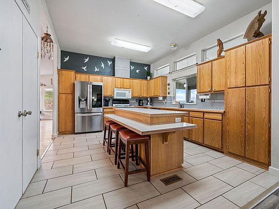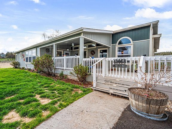 Looking for small acreage or a horse property that's within a short drive to town? This three bedroom, two bath Golden West Triple wide manufactured home sits on just shy of 5 acres. The home has an open layout with remodeling/upgrades throughout. Newer appliances, laminate & tile flooring, gutters and a brand new asphalt driveway and parking area. Other home features include; both covered/uncovered decks, A/C, separate office, detached XL 2 garage with a full bathroom, RV garage with full hook-ups, chicken coop, raised garden beds, horse shelter and a large dog kennel. Very nice property in a great location. Don't wait to schedule your viewing appt!