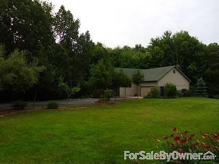 9 foot ceilings, both floors --Over-sized windows for maximum view5-acre wooded lot with front yard, large open side yard, plus garden plotWalk-out basement with mud room entranceAttached 2-car garage w/extended workshop area30 by 40 pole barn (w/electricity and paved floor)Blacktop driveway w/basketball court (half)Front porch deck Master bedroom with private deck/spaAll hardwood floors plus tiled bathroomsLarge bedrooms w/large closetsGreat room and kitchen w/island --Extra large pantryDining room/officeMultipurpose (game/TV/exercise) roomHallway library w/2 work areas, extended countertops and cabinetsIn-wall wiring for cable/network/speakersEnergy-efficient Geothermal heat/AC, all electricAll appliances (dishwasher, oven w/cook top, microwave, refrigerator, washer and dryer)In-wall vacuumWell, septic, water softener, sump pump Additional property info: http://www.forsalebyowner.com/listing/26342?provider_id=28079