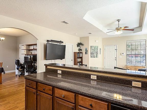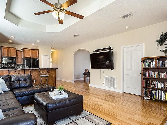 Tucked away in this perfectly kept neighborhood, you will feel at home when you walk through the door. A roomy living area with vaulted trey ceiling and hardwood floors greets you. The convenient kitchen is glowing with upgrades, including black appliances and a glass backsplash. You'll love the customized dining area with handy built-in shelving, perfect for a work-at-home atmosphere, or just playtime for the modern family. The kitchen and bathrooms feature granite and tile. The master bath features a double vanity, garden tub and separate shower. There's a lovely screened in back porch, a nice sized laundry room and a two car garage. The back yard is large and private for the best in outdoor fun. Freshly painted in soothing colors with so many upgrades, there is nothing to do but move in.
