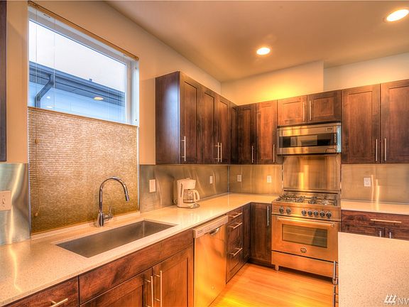 Convenient location for this nearly new 3-story contemporary town home, with 3rd story roof top views, north of Greenlake. Entry features Elephant skin tile to guest bedroom and full bath. Open steel stairwell w/bamboo treads features custom crafted steel hand rails which leads to a spacious main floor w/high ceilings, Bertazzoni gas range in a gourmet kitchen w/ modern dark cabinets and quartz counters. Large master bdrm with dual closets, full-bath w/ walk-in shower. A/C on main floor.