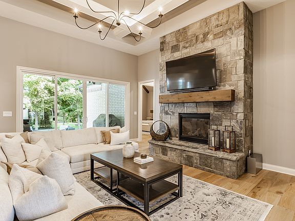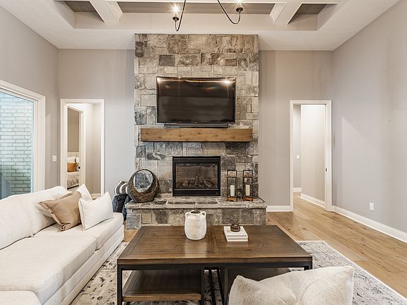 Discover refined living in this exceptional custom ranch, perfectly situated on a picturesque lot in the sought after Stonebriar community. Thoughtfully designed, the welcoming entry leads into a dramatic great room with a soaring 13' coffered ceiling, a striking stone fireplace, and expansive sliding doors that seamlessly connect to the outdoor living area. The gourmet kitchen is as functional as it is beautiful, featuring premium finishes, a stylish banquette dining nook and access to a serene screened-in porch, ideal for morning coffee or evening gatherings. The luxurious primary suite serves as a private retreat, complete with dual closets and a spa-inspired bath featuring an expansive shower that encloses a soaking tub. Two additional bedrooms and a full bath are located on the main level, with one bedroom offering the flexibility to serve as a home office. The finished lower level elevates entertaining with a custom home theater, built-in cabinetry, a wet bar, expansive rec/playroom, guest suite with full bath, and additional bedroom accommodations. All of this is set within a highly desirable school district, blending elegance, comfort, and convenience in one exceptional residence.