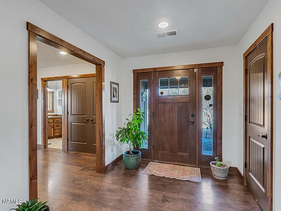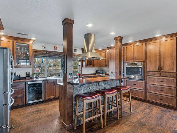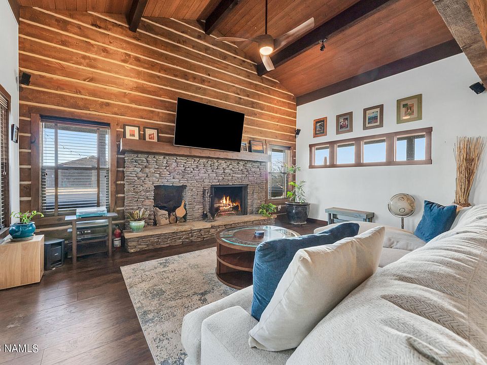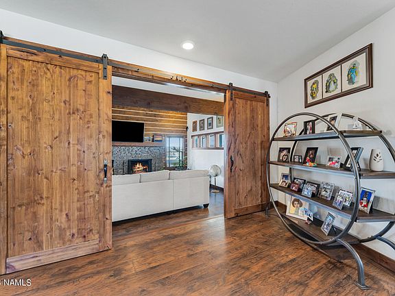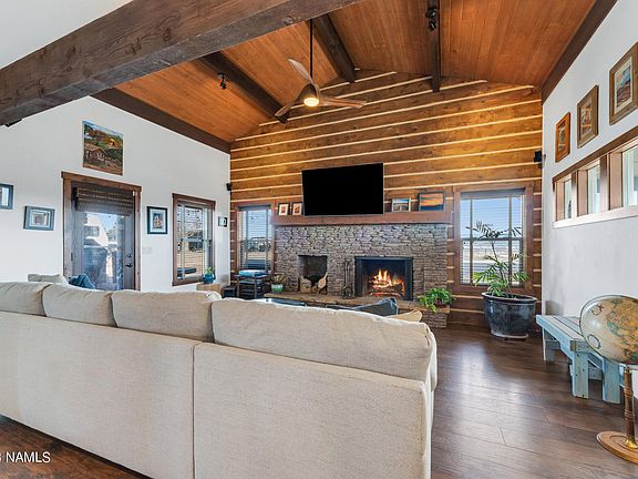 PHENOMENAL SINGLE-LEVEL horse property in Doney Park. You'll immediately appreciate the stunning barn doors leading into the living room, with vaulted ceilings, rustic cabin-like ambiance, chinked walls, and cozy wood fireplace. The open concept kitchen/dining area boasts beautiful butcher block counters. Completely gutted and re-modeled in 2016 with Alder cabinetry, SS appliances, breakfast bar, & wine fridge. New roof in 2023 & 4.74kW solar added in 2022. The spacious primary bedroom features a walk-in closet, en-suite bathroom, dual sinks, & huge soaker tub. Whether you're admiring the breathtaking views of the S.F. Peaks from the paver patio or enjoying a morning coffee under the front porch, this home is serenity. Working barn with 3 stables & tack-room! Bring your horses!