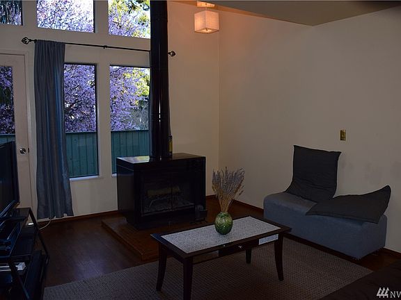 Townhome located in the amazing Green Lake area, close to transit, shopping, the U-district, and all that Seattle has to offer. Unit has private backyard for cooking out, front deck off of living room, oversized one car garage with many storage options, heated flex space, off street parking in front of garage that can fit 2 small cars. Open and bright living room w/retro wood burning FP, and eat in kitchen. Original Hardwood floors and soaring windows & ceilings in living room. No HOA