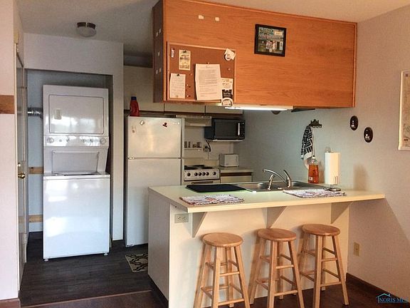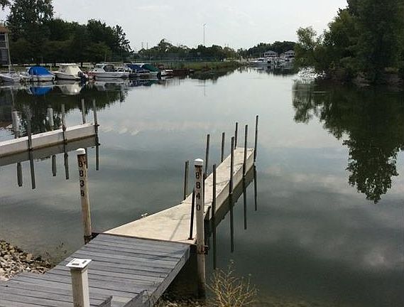 30' DOCK OUT YOUR DOOR! 1st floor condo w/large 3 season room! LR and master bedroom w/glass doors leading to 3 season room overlooking dock/canal. Kitchen w/appliances and stackable washer/dryer. Newer floor coverings, w/heater. Patio furniture, bed, couch and chair stay! Storage closet. Be on Lake Erie in minutes by boat. Pool and tennis courts to enjoy. Fish cleaning stations. Shelter house.