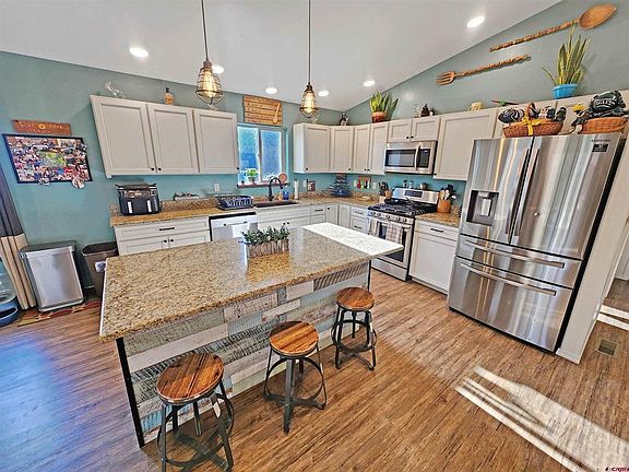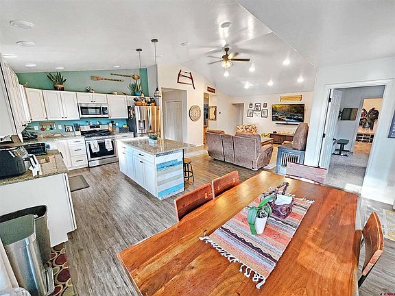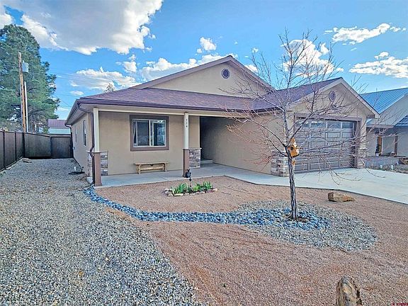Don’t miss this stunning home located in Mancos, Colorado, built-in 2019. It's a rare find, with 3 spacious bedrooms, 2 beautiful bathrooms, and an open floor plan with high ceilings throughout. The kitchen is a standout feature, with granite counters, plenty of cabinet space, and a center island with seating. Don’t forget the large pantry area for additional storage space. The primary suite is also spacious, complete with a large walk-in closet and primary bathroom. Each room has its own ceiling fan to support the central heating and cooling system. Step out back to the covered patio and firepit seating area, perfect for entertaining! The water feature pond full of goldfish and koi create a tranquil spot to relax, and there is an underground automatic sprinkler system to keep the yard looking lush and green. There's also a hand-built shed that blends into the privacy fence, perfect for storing all of your lawn tools and equipment. Speaking of the fence, it's a beautiful corrugated steel panel privacy fence that adds to the outdoor living area's charm. The front yard is xeriscaped other than a producing peach tree creating a low maintenance area to add curb appeal. The attached 2-car garage is perfect for keeping your vehicles cool in the summer and snow-free in the winter and big enough to store additional toys. And that's not all - this house even has a full RV hook-up on the east side to support your guests when they visit. This property truly has it all and is a fantastic place to call home. Call to schedule a showing today!