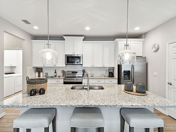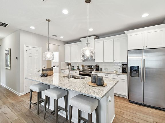 Welcome to this stunning, like-new Mastercraft 3-bedroom, 2-bath home, immaculately maintained with high-end finishes throughout. Step inside to find beautiful wood-look tile flooring, shaker-style white cabinets, and granite countertops in the kitchen, complemented by modern Kitchenaid appliances and a sleek subway tile backsplash. The open and airy living room boasts abundant natural light, a tray ceiling, and a stylish shiplap accent wall. The spacious primary bedroom offers an en-suite bath with dual sinks, a large walk-in shower, and a generous closet. Relax in the screened lanai overlooking the easy-to-maintain backyard. Rest assured, this home has new exterior paint with Rhino Shield and a termite bond. Enjoy the community’s fantastic amenities, including a pool and play area. Conveniently located just minutes from the beach, downtown, and more! Don’t miss out on this incredible home!