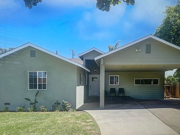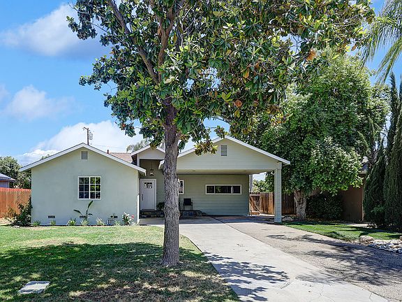 Enjoy comfort year-round with dual pane windows throughout. Step outside to your private retreat with a rock waterfall swimming pool, covered patio, concrete walkway leading to a well-built storage room, and lush landscaping that includes sago palms and a mature orange tree for a touch of Central Valley charm.