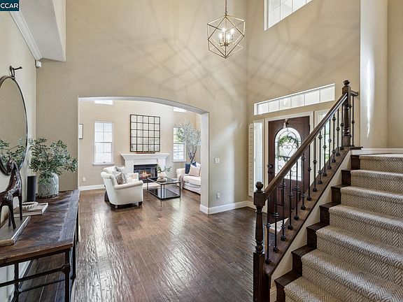 This exquisite home marries sophistication with everyday practicality, offering ample space on .59 acres. The intelligently designed floor plan ensures seamless flow for modern living. The grand living room, with soaring ceilings, creates an inviting atmosphere. Entertain effortlessly in the spacious dining and living areas. The eat-in chef’s kitchen is equipped with top-of-the-line appliances. This opens to a generous family room centered around a cozy fireplace. Convenience is paramount, with a main-floor bedroom that can serve as a home office, a full bath, and a laundry room. Ascend to the second floor to find four additional bedrooms, including a sprawling primary suite with a spa-like bath. Outdoor living is equally impressive, featuring a gleaming pool, hot tub, and a recently constructed kitchen with a grill, pizza oven, and more. A lounge area and oversized pavers lead to a shaded grassy play area. Storage and organization are effortless, with an attached three-car garage featuring built-in organizers. Nestled in a quiet neighborhood, this home is near top Bay Area schools, shopping, and recreation and offers easy commuter access