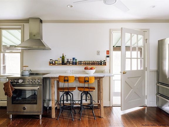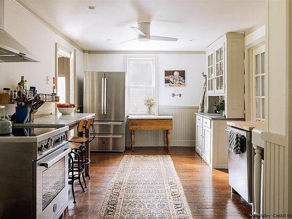 Open House: Saturday, 11/12 11-1pm. Welcome to Roxbury Mountain Farmhouse, a rare and exemplary Greek revival farmhouse. From its perch high on Scudder Hill Road, the mountains roll into the distance. Enjoy long views to Plattekill Mountain and along the East branch of the Delaware river as it runs from its headwaters near Grand Gorge down Scenic Route 30. This is a rare opportunity to own a unique and classic Catskills retreat, with room to explore. The sprawling 64 acre property climbs the mountain behind the home, with potential for winding trails, and more than one additional potential build site. The home has been recently renovated, with a designer’s touch. Previous owners shored up the foundation with a new poured concrete foundation, so this home is built to last, and the current owners updated and curated this home to what you see today. From the brand new front porch, enter the foyer and find the living room with a new cast iron wood stove and wide plank wood floors. A well appointed guest bedroom or potential home office adjoins the living room. The spacious main bathroom on this floor has been tastefully designed, with a claw foot tub, pedestal sink, and shower, in timeless style. Cream subway tile, and aquamarine square penny floor tile also match the powder room on this floor. The dining room is brooding and mature with dark walls, an antique farmhouse table, and art deco light fixtures. There is plenty of space to entertain your guests, and windows on both sides and french doors leading to this space allow ample light to contrast the dark styling. The picture window onto the front porch allows for dazzling mountain views as you dine. The kitchen has been fully renovated in modern farmhouse style with an oversized sink, built in hutches, and timeless original wainscotting. New Bertazzoni appliances include an induction range and range hood, refrigerator and dishwasher. A guest room off the kitchen receives light from front and side facing windows and has private access to the powder room through a newly added laundry/closet space. Upstairs, find original wide plank flooring, and two additional bedrooms. The back facing bedroom is set with two twin beds, but there’s plenty of room for a queen size bed, or use this space as a nursery or home office. The spacious front facing room is currently used as the primary bedroom, with ample space for a king sized bed, desk, dressers and armoire. Finally, the blank slate that can make this home the one of your dreams. To the right of the stairs, you’ll find an entire wing of the home that is begging to be an oversized primary suite. The current owners have a layout for a sprawling primary bedroom here, with walk-in closet and luxurious private bath. Roxbury Mountain Farmhouse is a truly special home, with potential to be a weekend retreat, full time residence, or a top tier rental property, here in short term rental friendly Delaware County. Explore the charming nearby hamlets of Roxbury, Margaretville, Andes and Bovina, and take advantage of skiing at nearby Plattekill and Belleayre Mountains. Come and make it your own. The property was recently combined from two parcels into one, and could be easily cloved along those lines to cut out a 6 acre lot with road frontage next door, or make grander plans for a large lot cut from the 64 acres.