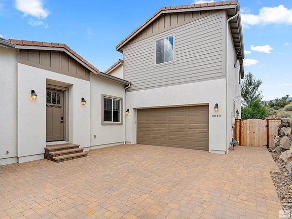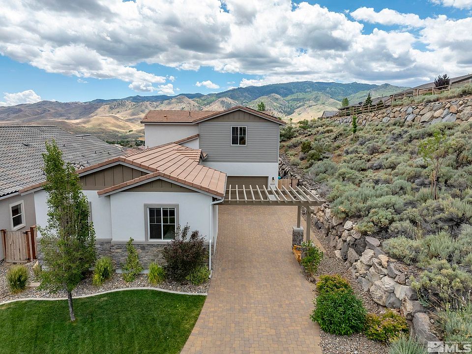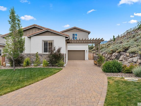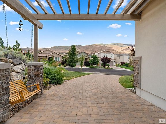 This exquisite Somersett home is nestled into a lovely upgraded cul-de-sac lot that offers spectacular views, privacy and excellent protection from the wind. Watch the weather roll in over the foothills and alpenglow on the mountains through the massive great room sliding doors - a view that provides the sensation of idyllic remoteness while being located in the heart of a friendly neighborhood with access to all the incredible amenities of Somersett living., The owned solar system covers the entirety of a family’s power needs, including EV charging. Inside, beautiful hand-scraped walls bounce the natural light and high ceilings and doorways throughout add to the sense of spaciousness. This home includes distinctive custom fine woodworking details, a gourmet kitchen with custom Kraftmaid cabinetry, and upgraded ceiling fans throughout. Come home to a stunning and functional custom hardwood entryway bench. Curl up and watch the snowfall or a summer storm from the custom-built window nook. Take care of household tasks with Sierra views from the bright and airy laundry area with gorgeous and functional custom hardwood shelving. The spacious first floor primary is a sanctuary with views of Peavine Peak, a large walk-in closet with plenty of hanging space and built-in shelving, and a luxurious en-suite bathroom with a large walk-in double-head rain shower, and free-standing claw-foot tub that is just waiting for an apres-ski soak. A bonus 4th bedroom with multiple windows boasting incredible 270 degree views was added to this floorplan during construction that offers an extra 560 square feet to the original plans. Additional upgrades include upgraded top-of-the-line kitchen appliances from GE, an on-demand hot water system that provides instant warmth from every faucet, a whole-house water purifier, and a reverse osmosis system. The home is pre-wired for security and surround sound, ready to play the soundtrack of your life. Out back, you'll find a private outdoor escape nestled into a protected hillside beneath a giant quaking aspen where you can watch the comings and goings of Sierra flora and fauna from the newly added backyard patio. Perennial florals burst forth every spring and summer from the custom raised garden beds with integrated zoned irrigation managed via a convenient app. This organic garden is set up to supply your family with a bountiful harvest of herbs, berries, vegetables, and gorgeous cut flowers throughout the spring, summer, and fall. The yard melts into the native hillside behind the fence line and the spectacular mountain sunrises, sunsets, rainbows, and stratospheric clouds that can be viewed over this unique and magical space are absolutely not to be missed. The 3-car tandem garage is currently set up as a craftsmen's/woodworker’s dream shop with integrated heat, natural light, and wiring for big power tools.