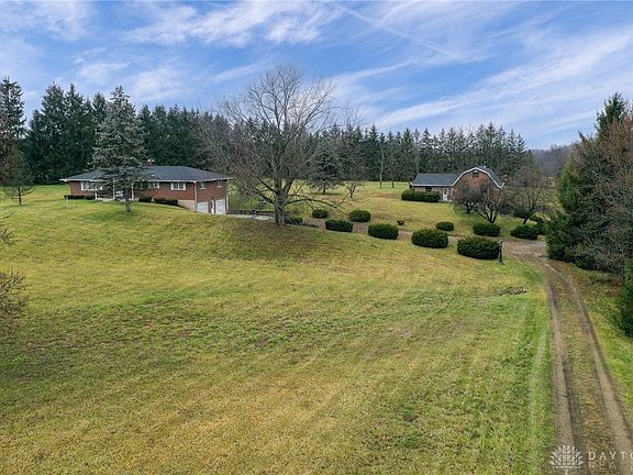 And there’s more outdoors. The home sits on a beautiful five-acre lot with rolling fields, surrounded by fencing. It features an impressive three-story brick building with four garage doors, ideal for storing cars or recreational use. Enjoy the views from the covered front porch, and use the two-car attached garage for even more storage space.