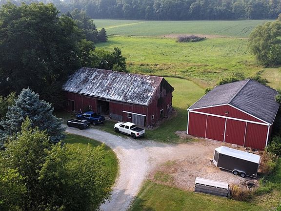 This gorgeous property is a rare gem! You'll have room to spread out and entertain, work on projects, or just enjoy nature on 10 private acres with a huge home, guest house converted from a 2-car detached garage, finished pole barn & a bank barn for storage/workshop, farmland, a meadow, woods, and a stocked pond! The home was formerly the White Fence Inn Bed & Breakfast, is handicapped accessible, and boasts 7 bedrooms and 7.5 bathrooms (1 bath in the guest house)! The spacious primary suite is a haven to itself, with cathedral ceiling, full bath with garden tub, and walk-in closet. There are 2 newer heat pumps and 2 hot water heaters in the house, and 1 hot water heater in the guest house. The land is beautiful, with a combination of tillable, wooded, and mowable acreage. This property has it all! Schedule your showing today!