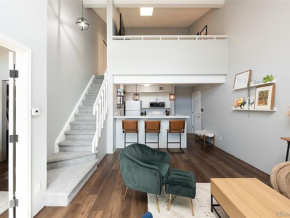 FREE LENDER-PAID 2/1 BUYDOWN AVAILABLE WITH PREFERRED LENDER! Enjoy a low-maintenance lifestyle in this fully move-in ready top-floor condo! The vaulted ceilings, south-facing windows, and skylights offer an abundance of natural light and an airy living space. The open floorpan is anchored by a cozy wood-burning fireplace in the living room that flows well into the updated kitchen with bar-top seating. The primary bedroom is complete with direct patio access, a walk-in closet, and an attached bathroom with a new vanity, lighting + hardware. There is new flooring, carpet + paint throughout. The upper level loft may be used as a second bedroom, an office, or a flex space. The spacious upstairs storage room has been converted into a second bathroom in other units with the same floor plan. You will love the outdoor living area on the private balcony patio, and the additional two attached storage closets. The low cost HOA covers some utilities + offers a private community pool. Hop on miles of trails just across the street at Platte River Trailhead Park, or get to I-76 or I-25 within minutes for a quick commute.