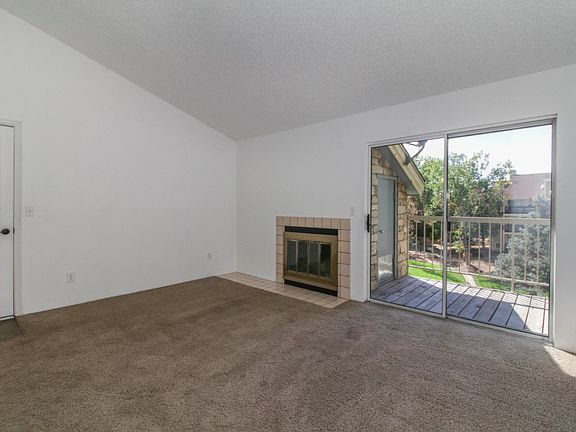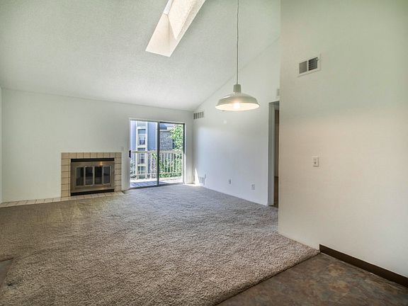 Beautifully maintained two-bedroom one bath penthouse condo with vaulted ceilings and a large balcony. The living room features a wood burning fireplace and sliding door to the balcony. The master bedroom has access to the balcony, and both bedrooms have large closets. The stackable washer and dryer are conveniently located right outside the bedrooms. This condo also includes a storage unit on the balcony, a reserved parking space, and a community pool.