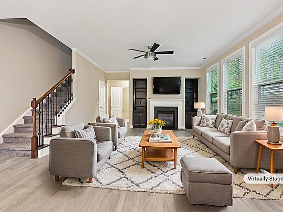 Welcome to your dream home! This property boasts a cozy fireplace, perfect for those chilly evenings. The neutral color paint scheme throughout the house provides a calming atmosphere. The kitchen is a chef's dream with an accent backsplash, all stainless steel appliances, a center island. The primary bedroom features a spacious walk-in closet. The primary bathroom is a sanctuary with double sinks, and a separate tub and shower for ultimate relaxation. Outside, enjoy a private patio and a fenced-in backyard, perfect for entertaining. This home is a must-see! This home has been virtually staged to illustrate its potential.