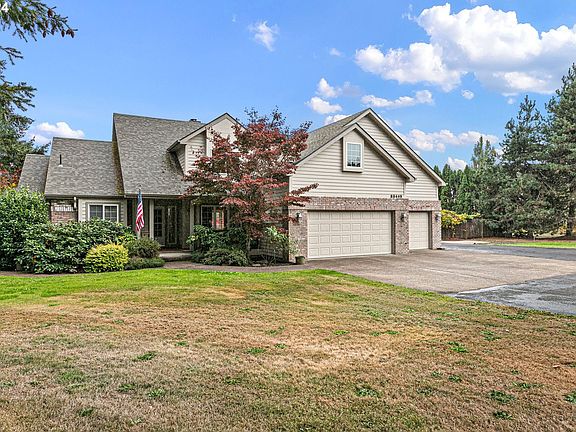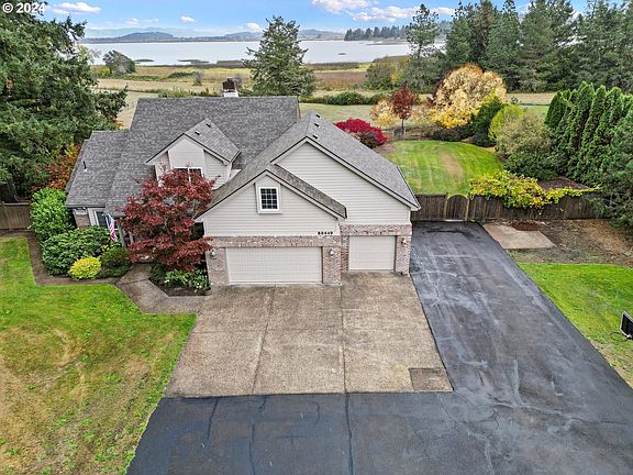 Fabulous lake view home on 2.08 acres in close in Veneta with covered front porch and gorgeous manicured landscaping! This 2nd owner home was the model on the builder's tour and features a soaring 2 story vaulted living room with expansive picture windows to take in the beautiful lake views. The living room boasts solid red oak hardwood floors and a double sided wood burning fireplace between living and dining area. The hardwood floors continue into the kitchen and dining. Kitchen also features granite counters with undermount sink, eating bar, pantry, built-in microwave and stainless steel refrigerator. Dog washing area and regular shower in the utility room! The primary suite is located on the main floor and is graced with view windows, vaulted ceiling, walk in closet and an additional regular closet. Primary bath has granite counters, double sinks, tub and unfinished walk-in shower. The main floor also features a formal dining room or den office. Upstairs you'll find two more bedrooms and a large bonus or family room with a storage room the full length of the upstairs. This lovely country estate also includes a 3 car garage, RV parking, high producing well with water softener treatment, brand new concrete back patio, dog kennel, 6 year old heat pump and composition roof that was replaced in 2016. Access to lake over Army Corps of Engineers Land. Come experience this truly amazing setting and make this home and property yours today!