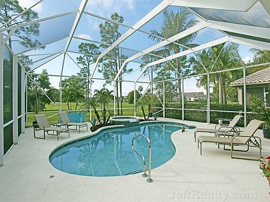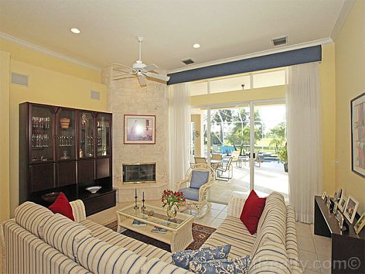 Serene golf course views & southern exposure. This 3BR + study + 3-car garage sits on an acre and has an easy floorplan with volume ceilings and lots of light. Open kitchen, fireplace, built-ins & accordion shutters. Huge covered/open screened lanai.