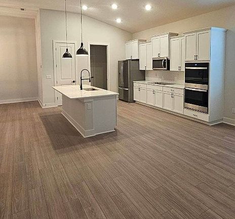 Welcome to the Palm Beach, a four-bedroom, single-story retreat that masterfully blends luxury, functionality, and architectural sophistication. Located in Bryceville at Stables at Cary Forest, this exceptional home offers an elevated living experience defined by open spaces, premium finishes, and thoughtful details throughout. From the moment you enter through the covered front porch, you'll be drawn into a spacious open-concept layout that seamlessly connects the main living areas. The chef-inspired kitchen serves as the centerpiece, equipped with stainless steel appliances, quartz countertops, and 42-inch upper cabinets with crown molding. Adjacent to the kitchen, the oversized family room and dining area open directly to a covered outdoor living space, creating the ideal setting for gathering with friends or relaxing in the Florida breeze.